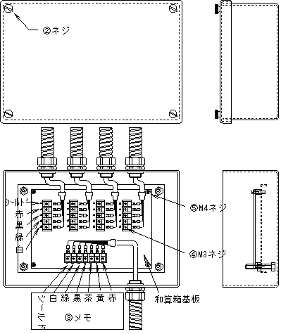 図は、市販BOX(FRP製)の物を記述、それぞれのBOXで、ネジ(本数等)が異なります。